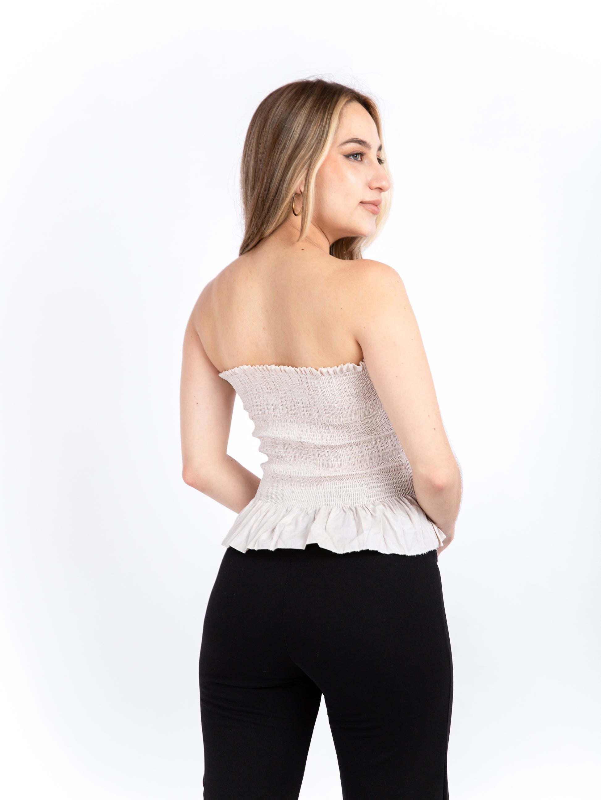 Detalles: Se destaca con su escote recto y corte ajustado en el busto para un ajuste perfecto, seguido de un elegante volante que llega hasta la cadera.
